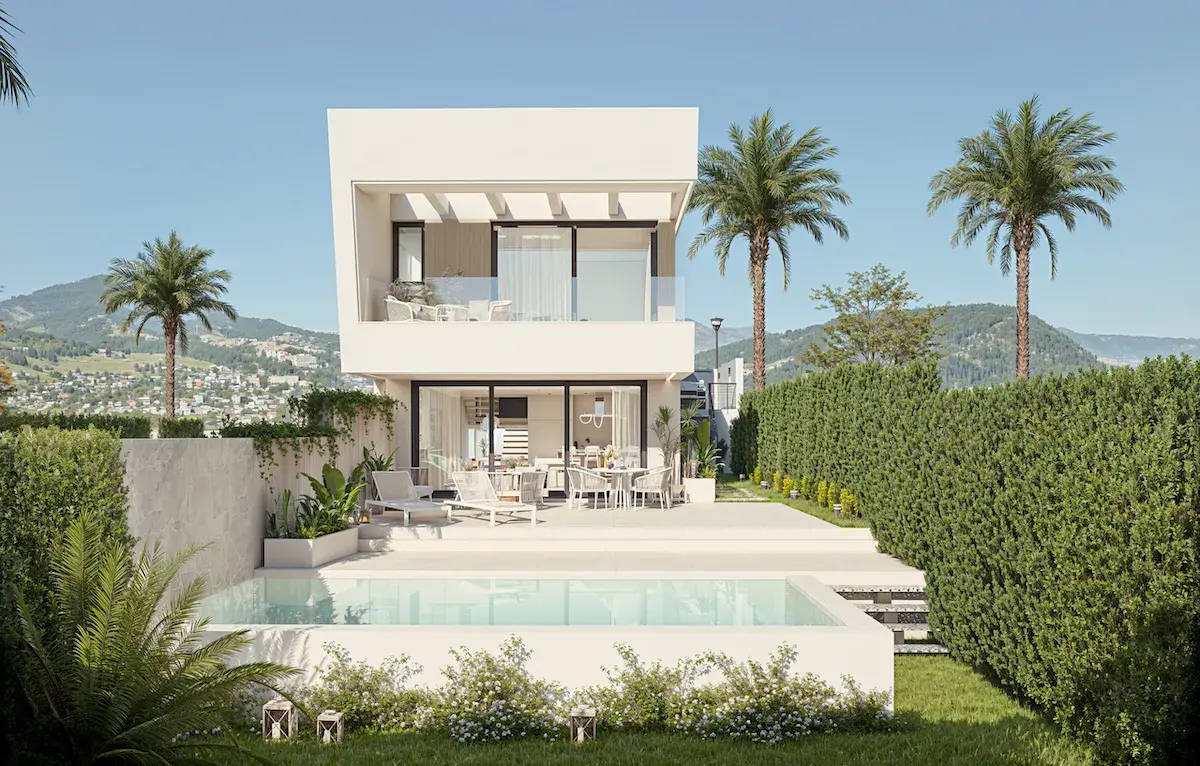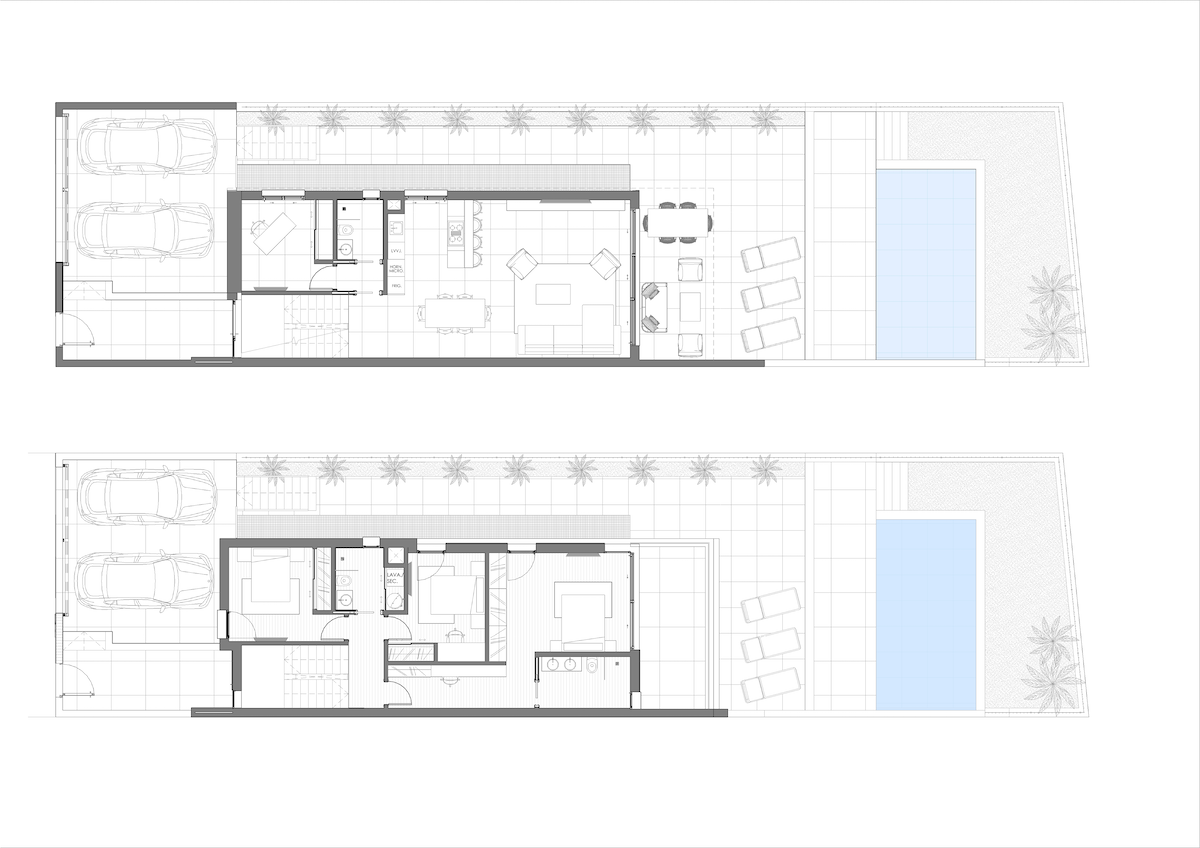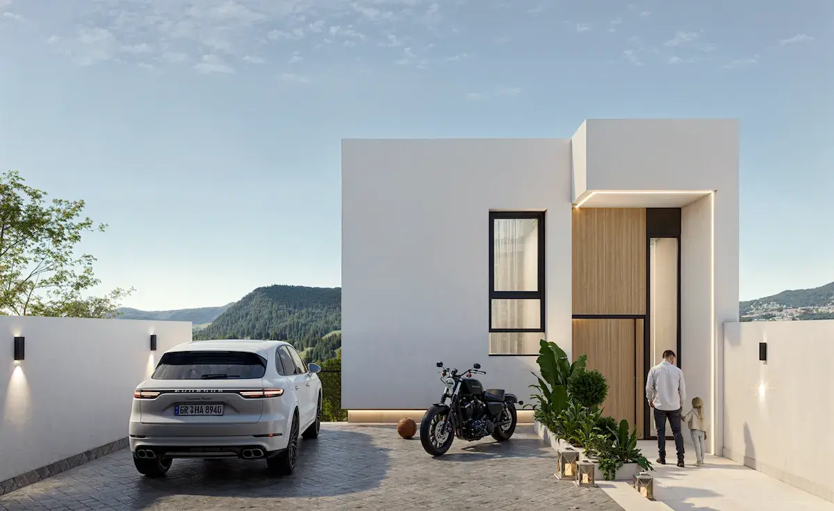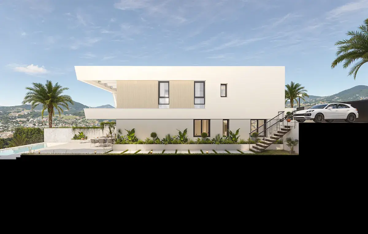 El diseño arquitectónico se potencia a través de una combinación de materiales que destacan visualmente. La planta alta, con una estética limpia y moderna, presenta una materialidad blanca combinada con porcelánico que imita la madera, mientras que el volumen diagonal que define la terraza apergolada del dormitorio principal añade dinamismo al conjunto. Por otro lado, la planta baja semienterrada, tratada exteriormente con tonos grises y pétreos, se diferencia claramente del volumen superior, creando un contraste elegante y moderno.