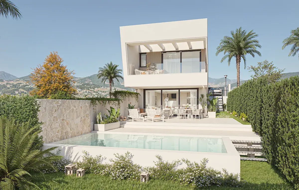 En el interior, la planta alta alberga tres dormitorios, siendo uno de ellos en suite, proporcionando privacidad y confort. En la planta baja, concebida como el área social de la vivienda, encontramos un despacho, un aseo, y el salón comedor con cocina abierta. Este espacio está orientado hacia el jardín y la piscina, con un porche cubierto que invita a disfrutar de momentos de relax al aire libre.