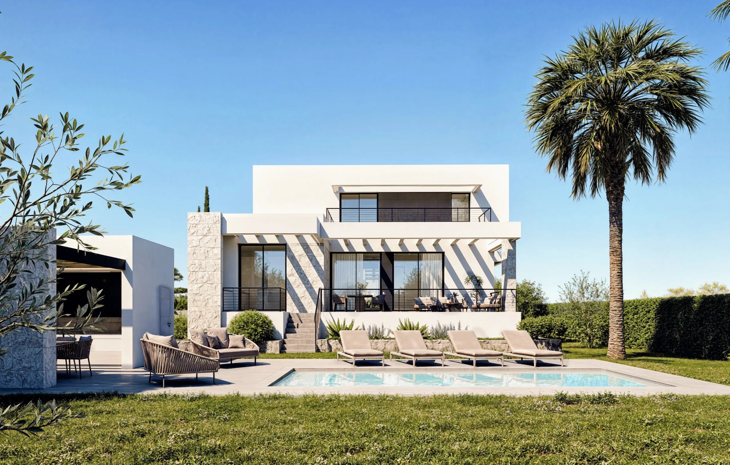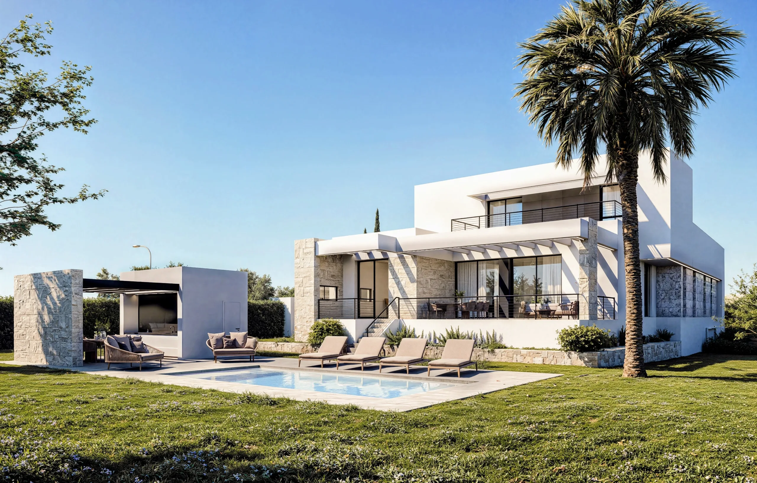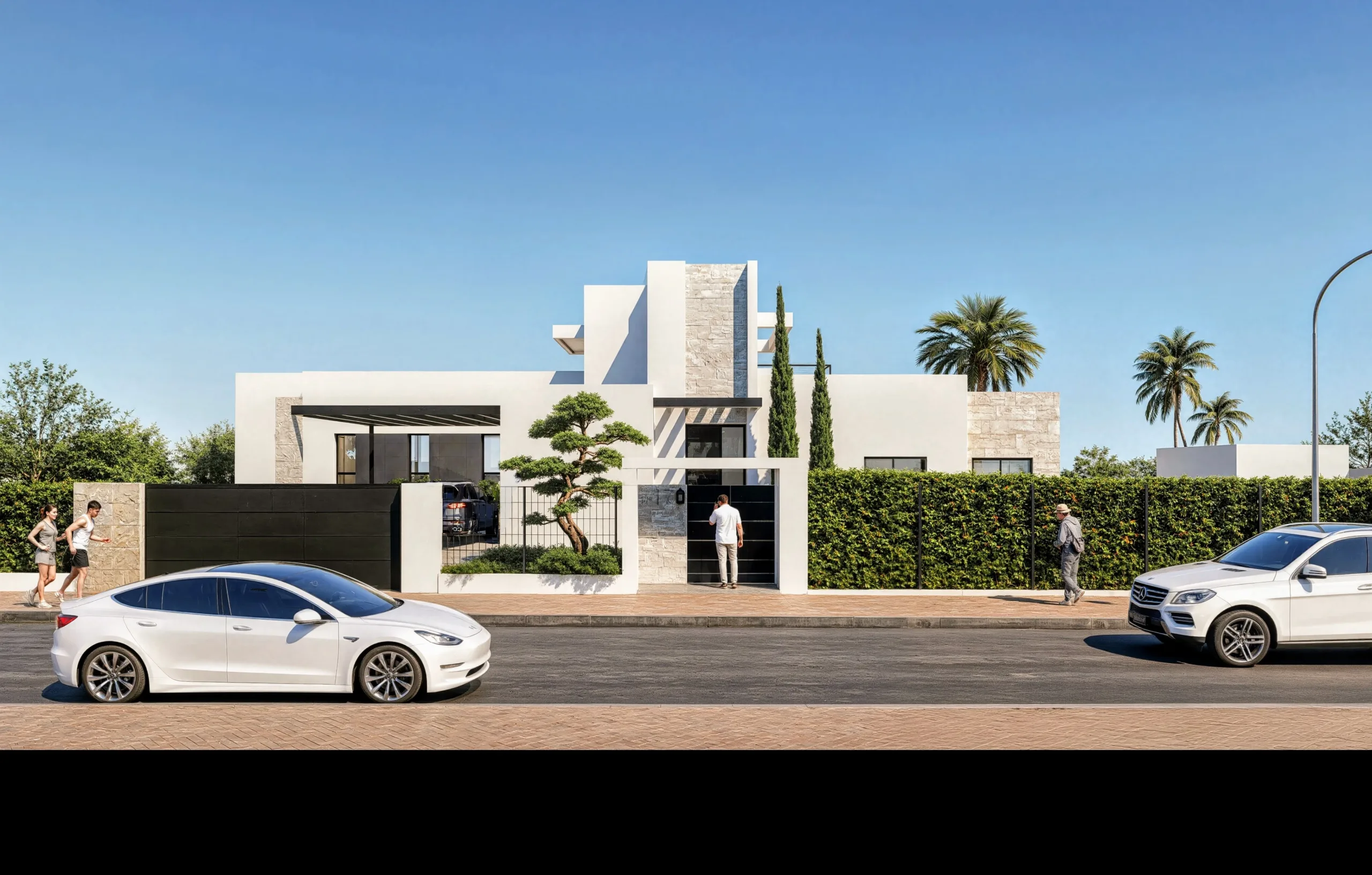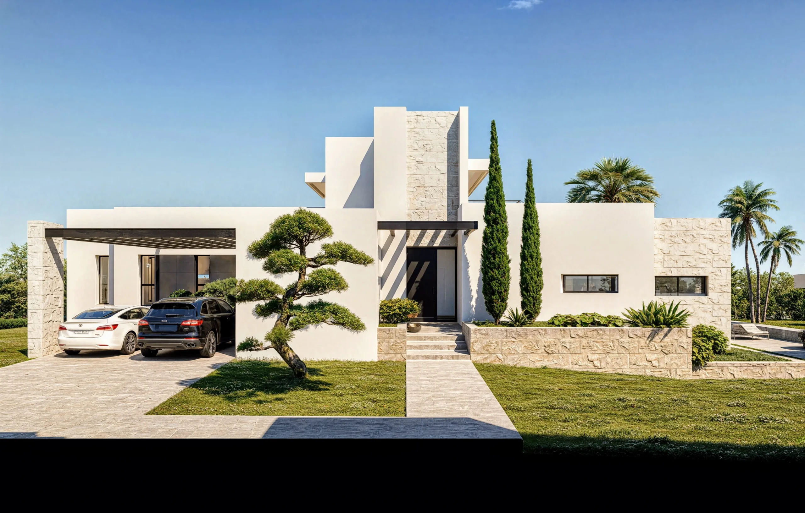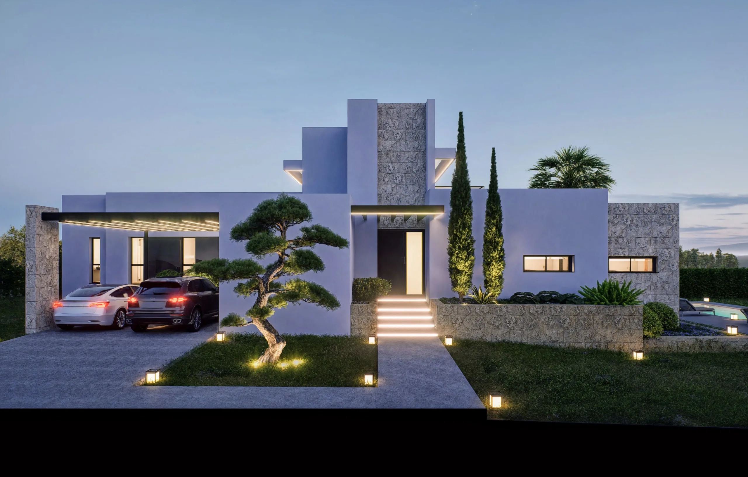 Definida por líneas puras, volúmenes geométricos y grandes ventanales, Horizonte de la Huerta transmite elegancia y exclusividad. El contraste entre los revocos blancos, la piedra natural y las carpinterías oscuras aporta fuerza y carácter, generando un estilo atemporal que conecta con el paisaje mediterráneo.