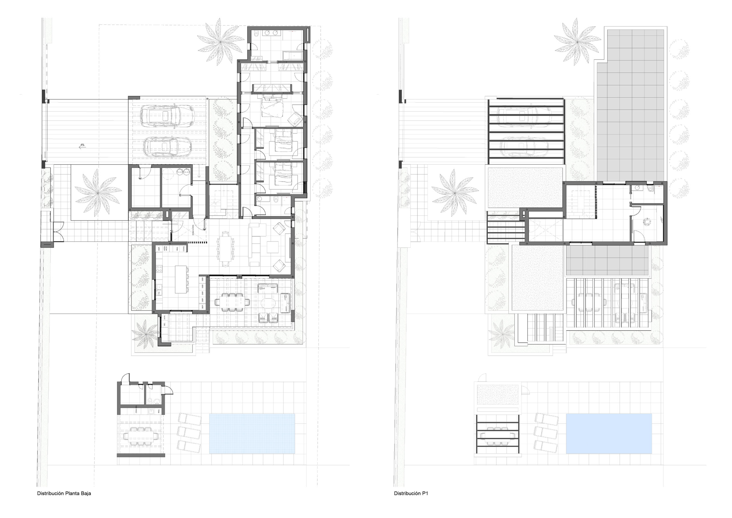 La composición volumétrica combina la horizontalidad de los planos principales con elementos verticales como los muros de piedra y la vegetación esbelta, creando una arquitectura que transmite modernidad, solidez y serenidad.